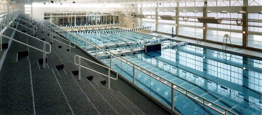 The balcony allows for over 1,000 spectators to view competition. In addition, the South end of the pool has a glass window adjacent to a viewing area which can accomodate another 500 spectators in a climate-controlled environment. At the east end, spectators can get some fresh air and sunshine in the courtyard, adjacent to the football stadium.